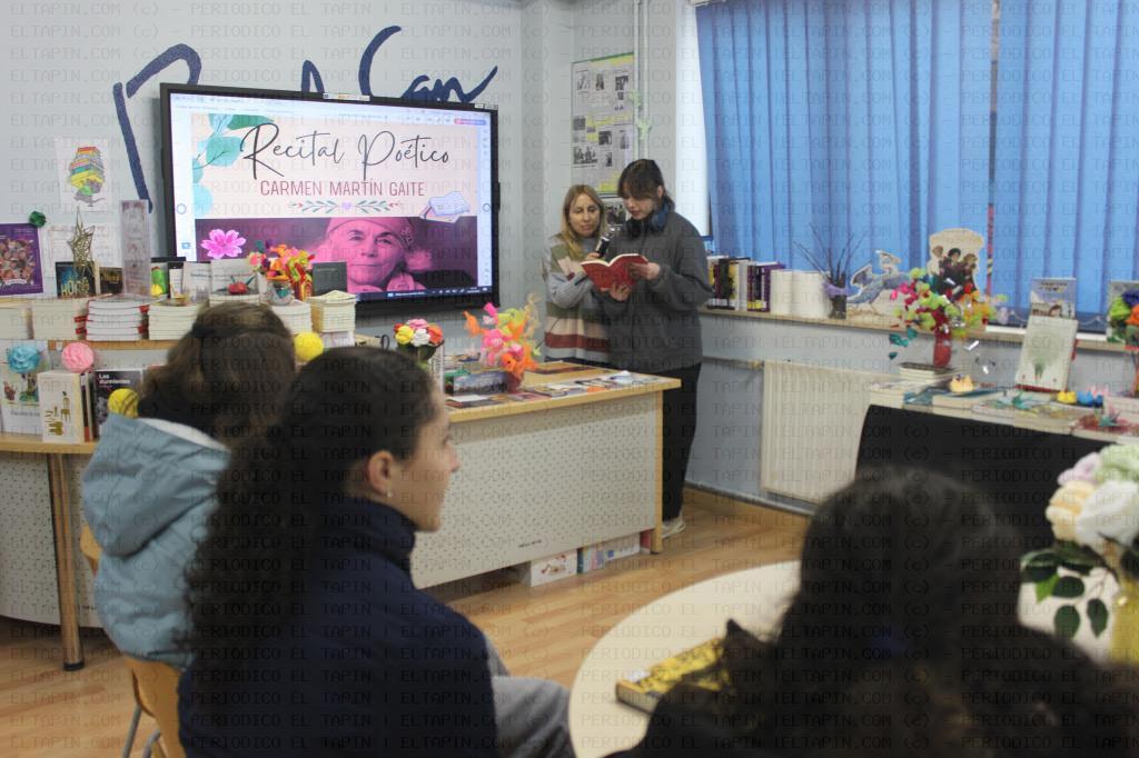 El departamento de la biblioteca del IES Llanera organizó, el jueves 6 de febrero, durante el recreo un recital poético para celebrar el centenario del nacimiento de Carmen Martín Gaita. “Es una autora muy querida, a la que leemos mucho, pero sobre todo la leemos a través de la prosa, de sus novelas, “Caperucita en Manhattan”, de hecho, es uno de los libros que recomendamos en los cursos de la ESO, “Entre visillos” y otros libros, pues son muy leídos y trabajados en las aulas. Lo que faltaba quizás era conocer en profundidad su poesía, entonces como tenemos la suerte de que el año pasado “La Bella Varsovia”, que es una editorial, publicó la antología de la poesía reunida, a través de esa antología podemos ver los primeros poemas y un recorrido por su trayectoria; los temas que al final siempre están ahí y le preocupan, y una mirada quizás de una poesía que merece la pena ser celebrada, entonces la mejor manera para nosotros de hacerlo era levantar esos poemas con la voz, recitarlos y hacerlos aquí en la biblioteca, con las niñas de la biblioteca”, explicó la responsable de la biblioteca, Raquel Fiera.