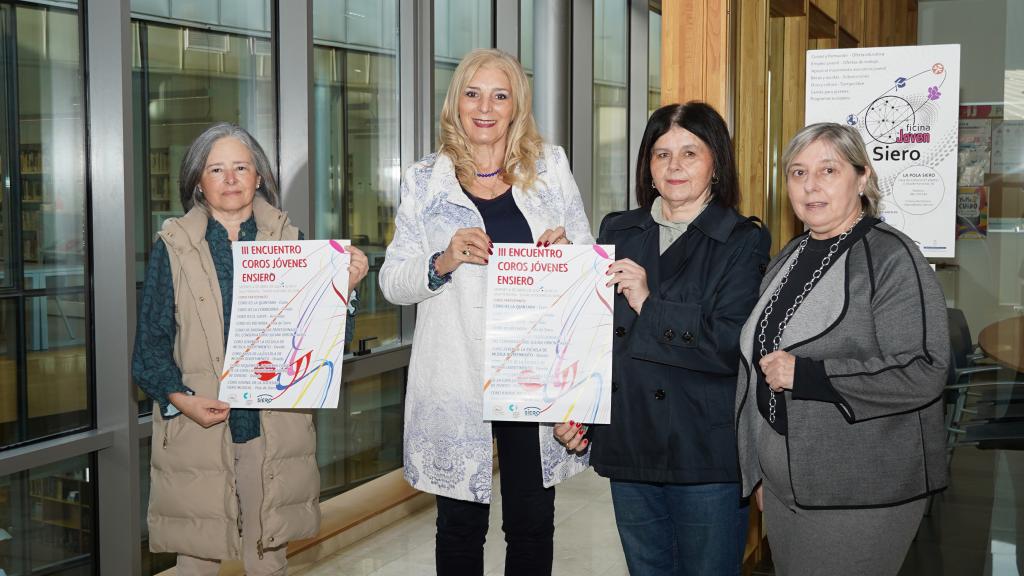 La concejala de Cultura, Recursos Humanos y Policía Local, Aurora Cienfuegos, junto a Ana Elena Suárez, presidenta de Siero Musical; Mónica Nachón, secretaria de Siero Musical, e Isabel González, directora de la Fundación Municipal de Cultura presentaron el III Encuentro de Coros Jóvenes en Siero, que tendrá lugar el viernes 4 de abril a las 20 horas en la Sala Principal del Teatro Auditorio de Pola de Siero.