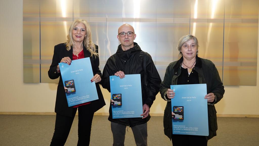 La concejala de Cultura, Aurora Cienfuegos, junto a Israel De la Peña, artista, e Isabel González, directora de la Fundación Municipal de Cultura, presentaron la exposición “Inercia”. La muestra estará abierta al público en la Casa de Cultura de Pola de Siero desde el viernes 4 de abril hasta el 30 de mayo.