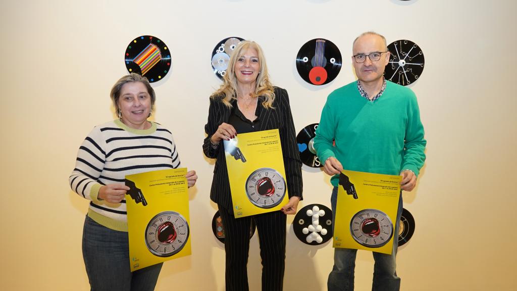 La concejala de Cultura, Recursos Humanos y Policía Local, Aurora Cienfuegos, junto a Isabel González, directora de la Fundación Municipal de Cultura y Óscar Caso, técnico municipal, presentaron la exposición “El agrado de buscar” del artista Luis Vega que se inaugura el próximo lunes en el Centro Polivalente Integrado de Lugones.
