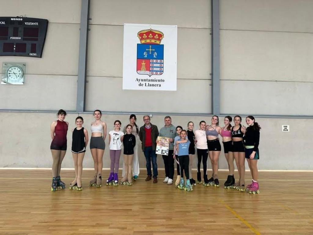 El concejal de Deportes, José Antonio González, el coordinador municipal, Antonio de Luis Solar, la entrenadora del club Patín Llanelux, Lara Rodríguez, y varias patinadoras presentaron el V Trofeo del club, que se celebrará en el polideportivo municipal de Lugo de Llanera el sábado 26 de abril.