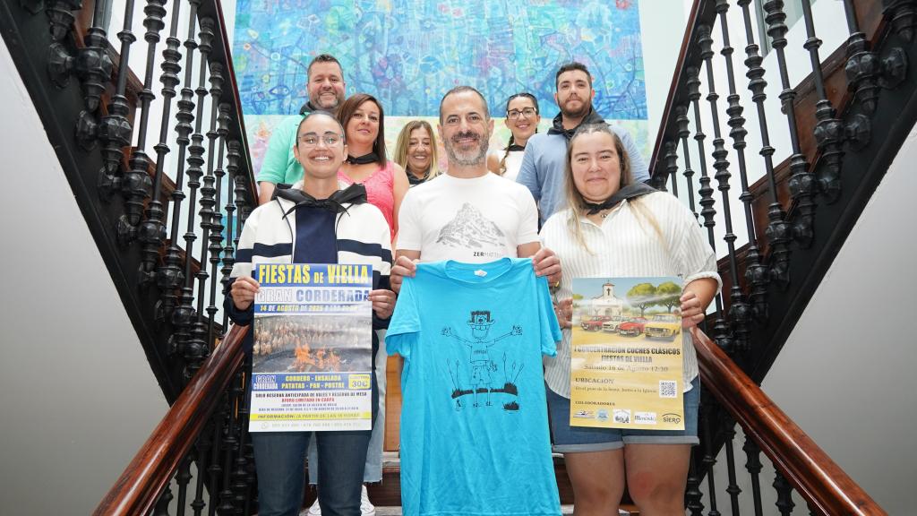 El alcalde de Siero, Ángel García, la concejala de Infraestructuras Urbanas, Limpieza Viaria y Residuos Sólidos Urbanos, Sonia Lago, junto a Andrea Pérez, Tamara González, Adrián Menéndez, Covi García, Lucía Vázquez y Marcos Castro, miembros de la asociación de festejos "Viella en Fiestas" presentaron la próxima edición de las mismas que tendrá lugar del 14 al 17 de agosto, ambos inclusive.