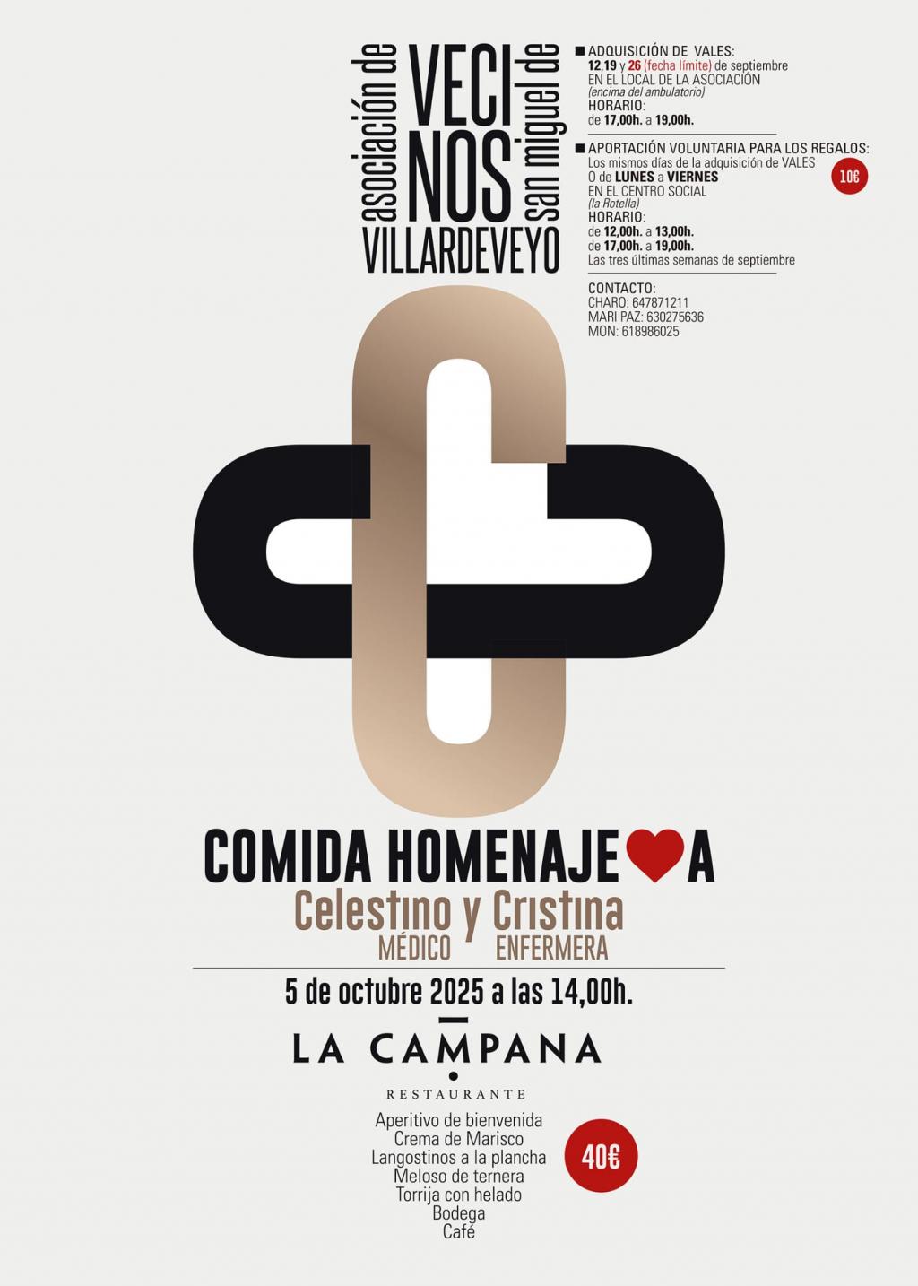 La Asociación de Vecinos de San Miguel de Villardeveyo organiza para el día 5 de octubre a las 14 horas en el Restaurante La Campana, en Pruvia, una comida homenaje a Celestino y Cristina, médico y enfermera del centro periférico de Villabona. La adquisición de los vales son los días 12,19 y 26 de septiembre, en el local de la Asociación de 17 a 19 horas.