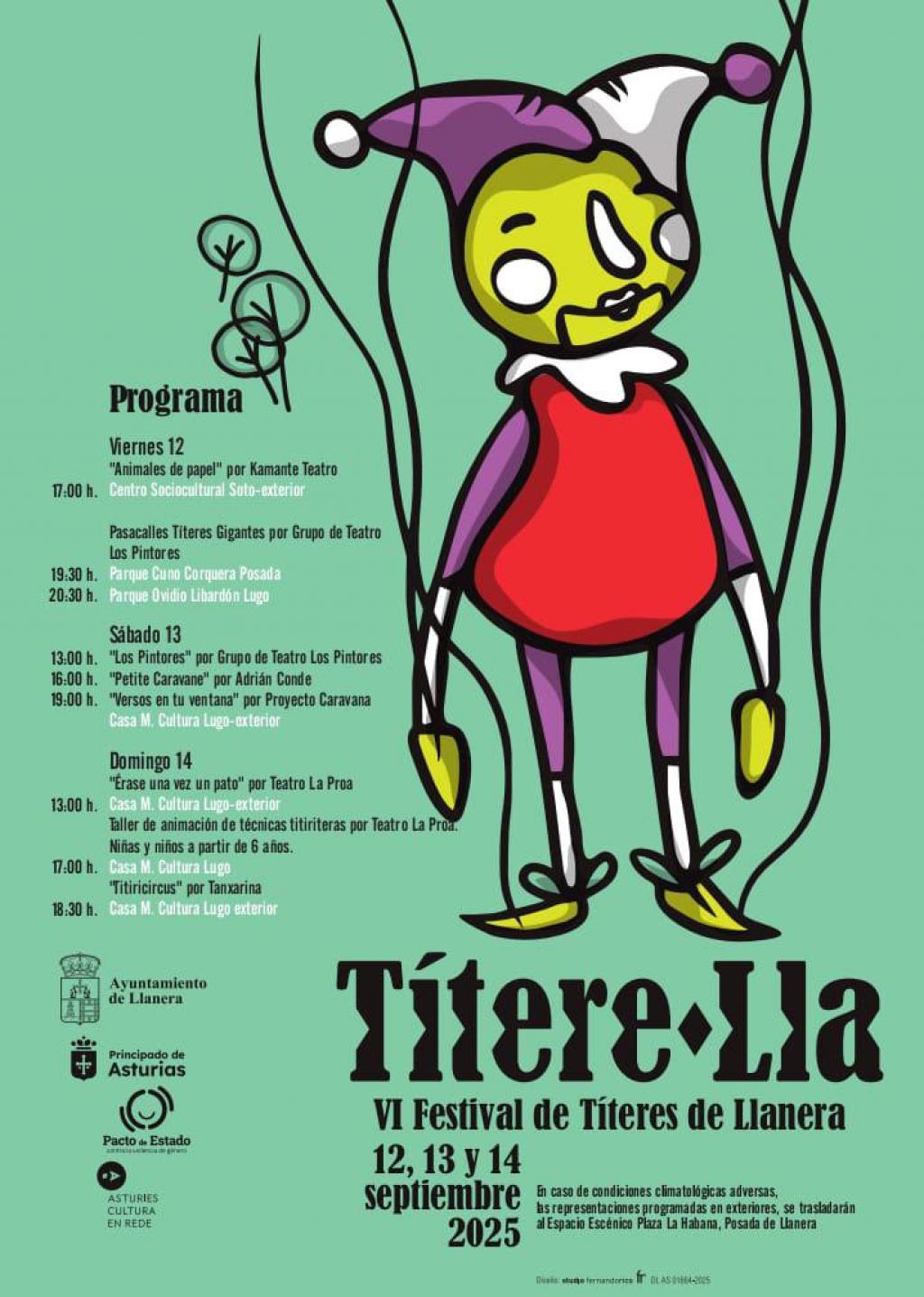 Del 12 al 14 de septiembre Lugo y Soto de Llanera acogen las actuaciones del Festival Títere-Lla, organizado por el Ayuntamiento de Llanera y que cuenta con la colaboración de la compañía de teatro llanerense, Los Pintores. Uno de los responsables de Los Pintores, Maikel Valdés, explicó que este año se cumple la sexta edición del festival, que se inició con la actual alcaldesa, Eva María Pérez, como concejala de Cultura, cargo que ostenta ahora la edil Montserrat Alonso.
