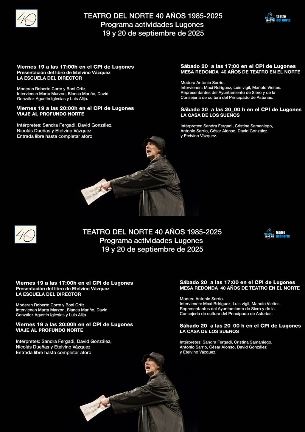 Los próximos días 19 y 20 de septiembre, en el Centro Polivalente Integrado de Lugones se celebran los 40 años del Teatro del Norte. Todos los días a partir de las 17 horas tendrá lugar una mesa redonda sobre estos cuarenta años del Teatro del Norte. Una vez finalizada cada mesa, a partir de las 20 horas, habrá una representación teatral. Será completamente gratuito.