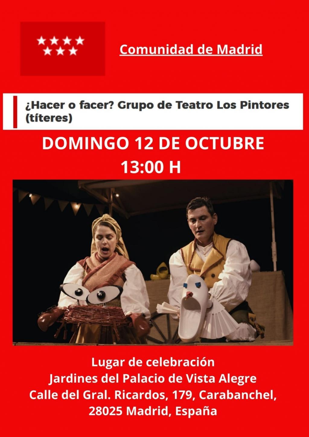 El próximo 12 de octubre, Teatro Los Pintores presentará su obra ¿Hacer o Facer? en los Jardines del Palacio de Vista Alegre, en Madrid a las 13:00 horas.