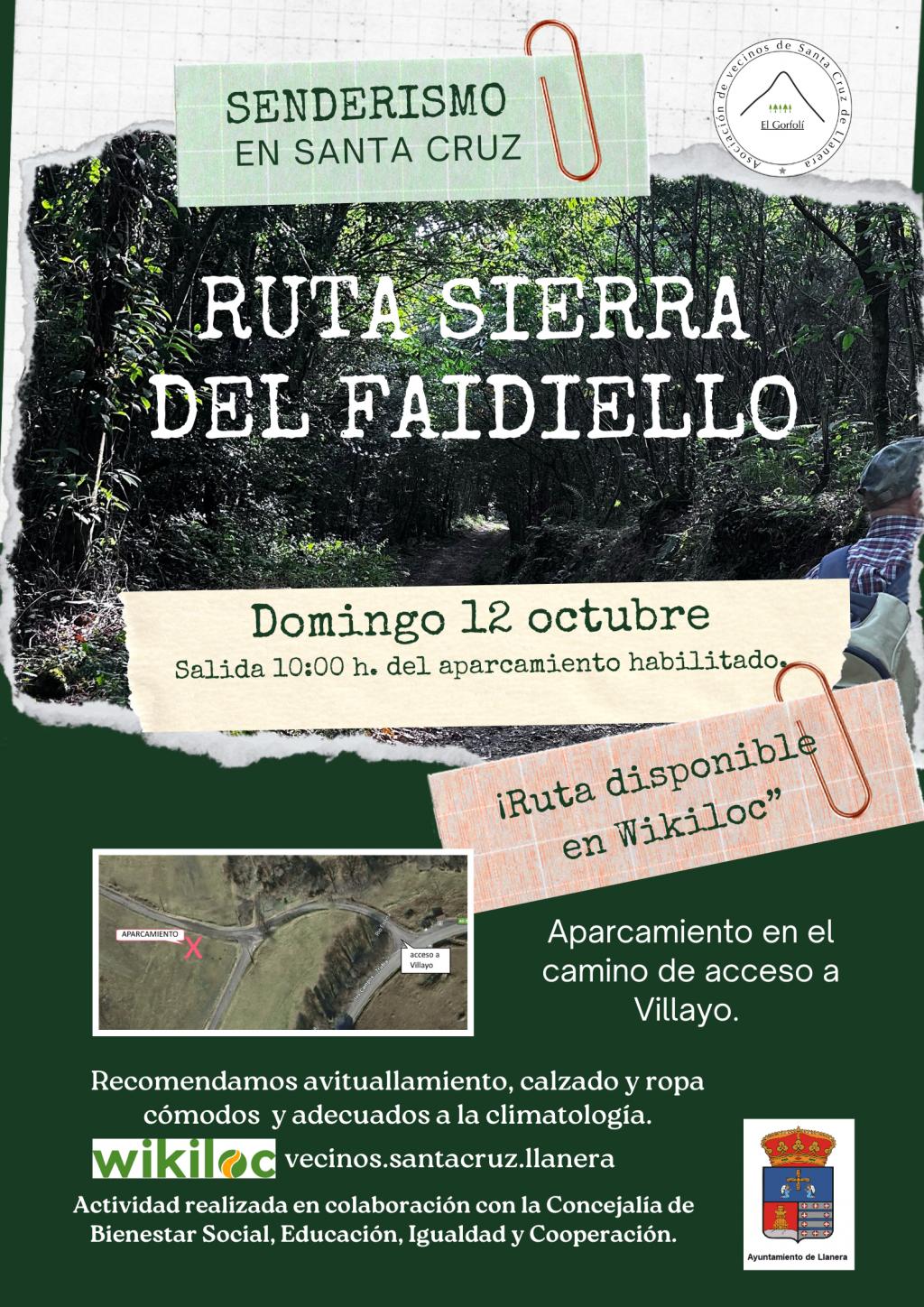 Pero las actividades no se detienen en Santa Cruz. El próximo domingo 12 de octubre se realizará una salida por la sierra del Faidiello, abierta a todas las personas aficionadas a caminar por el monte. El punto de partida será el mismo que en la Jira al Gorfolí: la zona habilitada como aparcamiento en “La Pradina”, finca donde tradicionalmente se celebra la fiesta de Fanes.