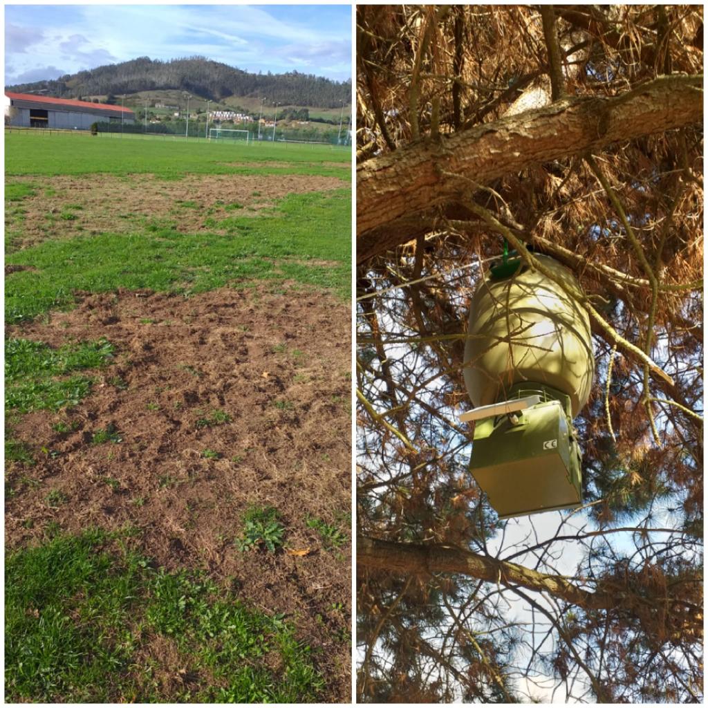 Se trata de un cebadero programable que esparce la comida en un radio de unos 10 metros y que funciona con placa solar, con ello pretende atraer a los animales a los espacios más alejados del complejo deportivo y evitar, o minimizar en su caso, daños como los ya causados en el campo de fútbol 2 que tiene el césped totalmente levantado en determinadas zonas. La inquietud futbolera de los cerdos salvajes ha obligado a suspender entrenamientos como le ha sucedido al equipo del Colunga.