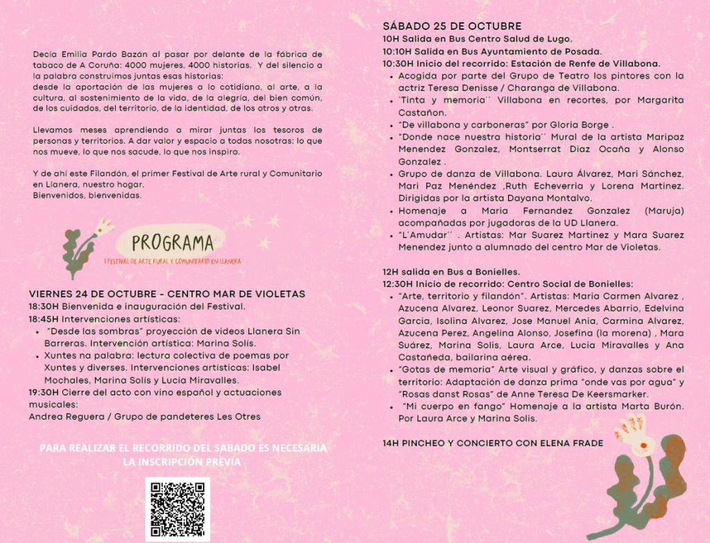 La Asociación La Mar de Violetas junto con varios colectivos vecinales y cultural de Llanera organizan el evento “Filandón na Seronda”, que se celebrará los días 24 y 25 de octubre. Colabora también el Ayuntamiento de Llanera. El programa es el siguiente: