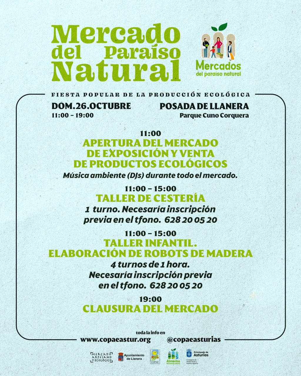 Además, entre las 11:00 y las 19:00 h se podrá disfrutar de música en directo, talleres para jóvenes y adultos y de muy variados productos ecológicos, en su mayoría respaldados por la marca Alimentos del Paraíso Natural. Como novedad respecto a la cita de Ribera de Arriba, se incluirán varios puestos de artesanía asturiana.