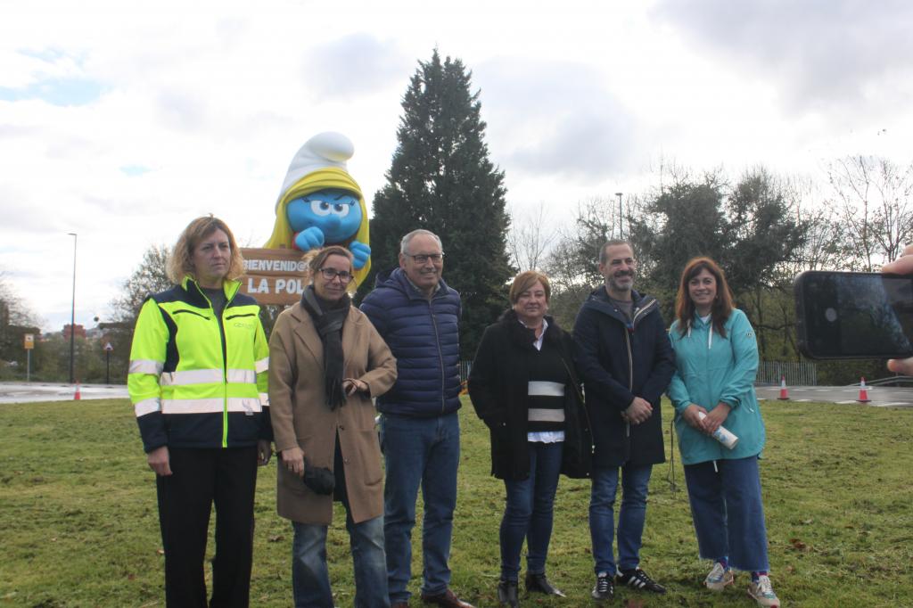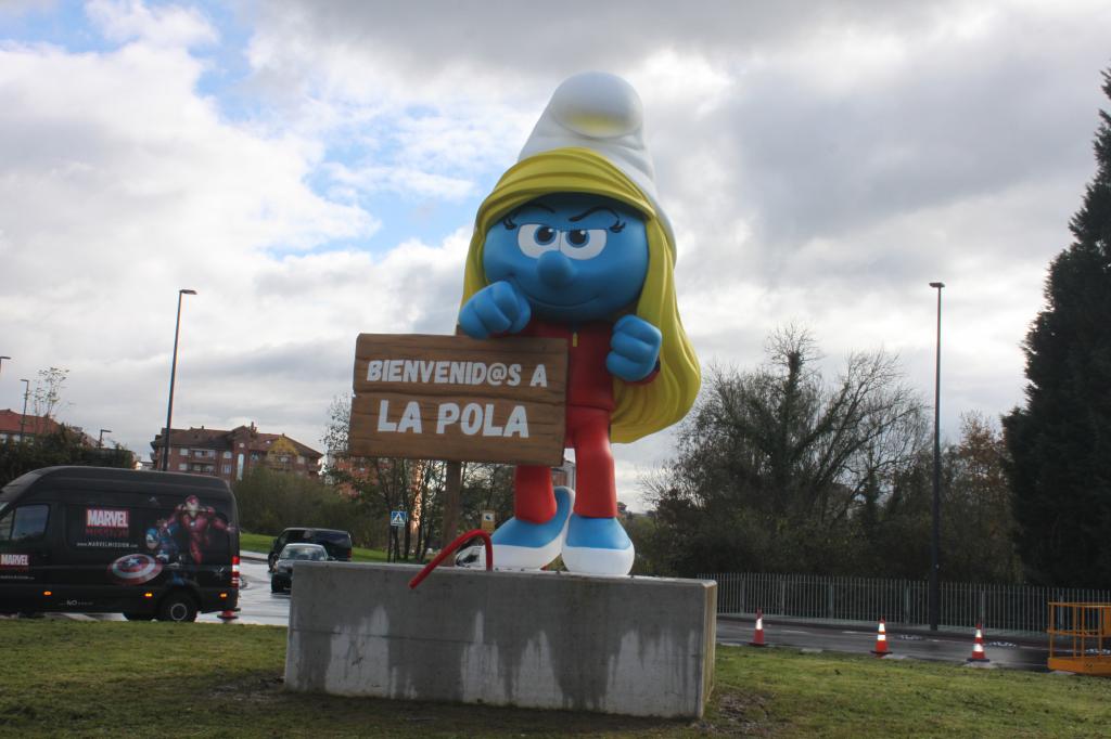 Ana Nosti, visitaron la instalación de la nueva figura de Pitufa Karateca, que da la bienvenida a los visitantes en los accesos a Pola de Siero desde la Autovía Minera. La figura mide 4,5 metros y sostiene un cartel imitando madera con el texto “Bienvenidos a La Pola”, de características similares al Pitufo Gruñón instalado en Lugones.