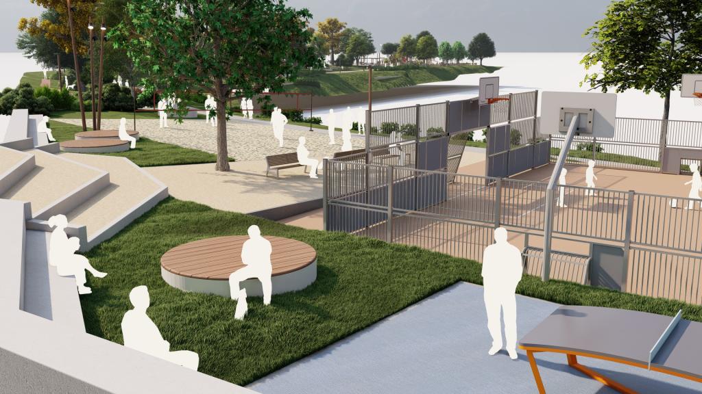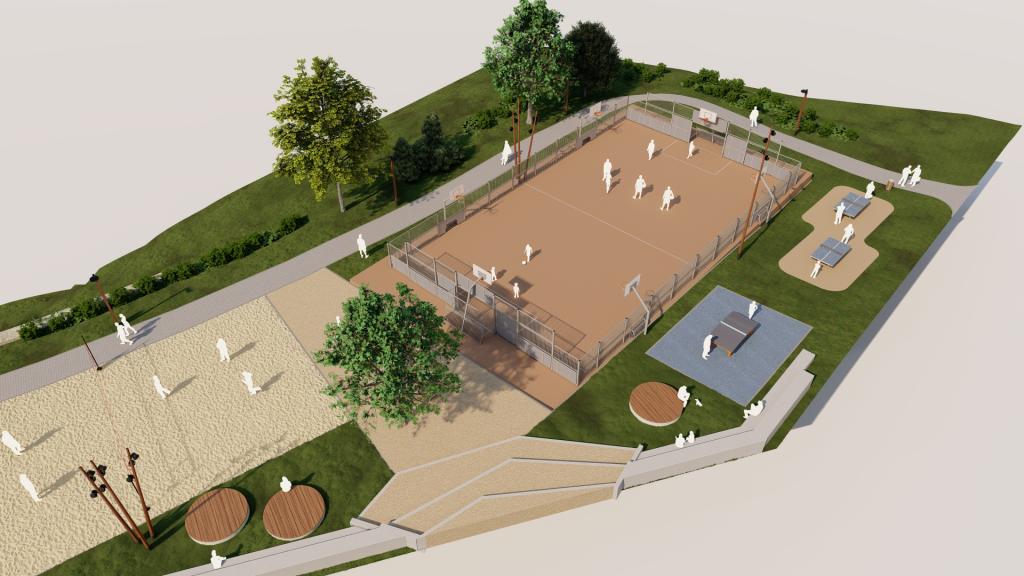 El proyecto contempla también un área deportiva con pista multideporte cerrada y otras instalaciones complementarias, como una cancha de vóley playa, ampliando la oferta de espacios para la actividad física al aire libre.