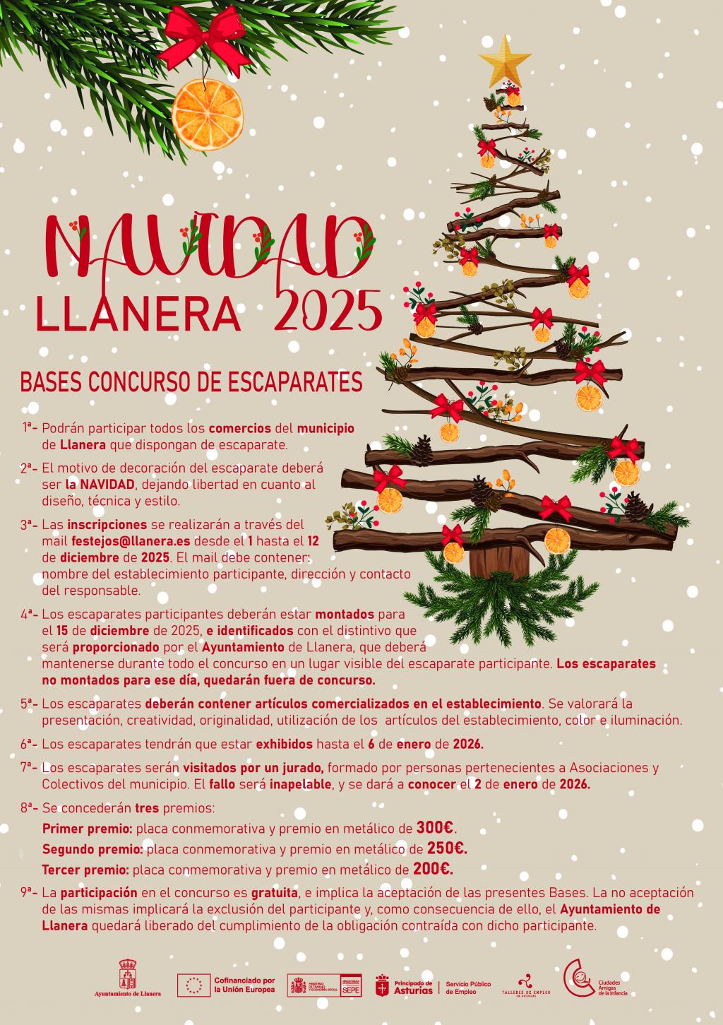 Otra de las citas tradicionales en estas fechas es el “Concurso de escaparates navideños”, dirigido a los comercios del municipio. Las inscripciones se realizarán a través del email festejos@llanera.es, hasta el 12 de diciembre. El mail debe contener: nombre del establecimiento participante, dirección, y contacto del responsable. Los escaparates participantes deberán estar montados para el 15 de diciembre, e identificados con el distintivo que será proporcionado por el Ayuntamiento de Llanera. Los escaparates, que deberán contener artículos comercializados en el establecimiento, tendrán que estar exhibidos hasta el 6 de enero de 2026. Se valorará presentación, creatividad, originalidad, utilización de los artículos del establecimiento, color e iluminación. El fallo se dará a conocer el 2 de enero de 2026 y se concederán tres premios (1º: 300 euros, 2º: 250 euros y 3º: 200 euros).