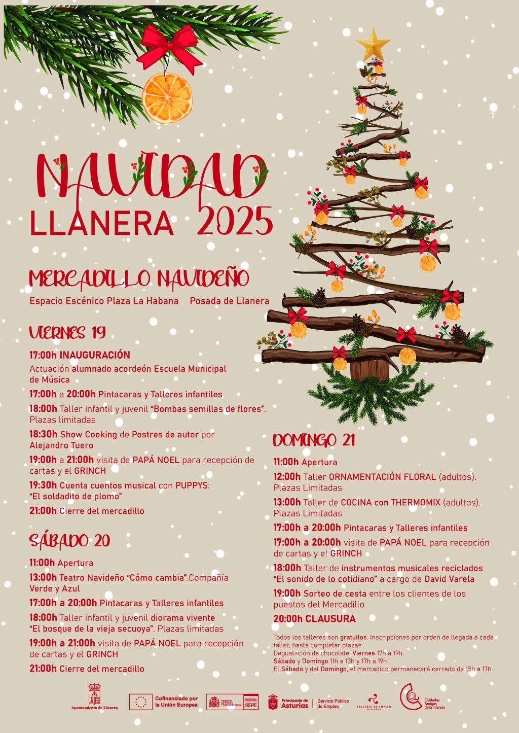 Los comercios de Llanera también tendrán especial protagonismo en el Mercadillo Llanera Navidad, que se celebrará en la Plaza de La Habana los días 19, 20 y 21 de diciembre. Además de venta de productos, el programa del mercadillo incluirá música, talleres gratuitos y actividades infantiles. “Una nueva oportunidad para seguir mostrando nuestro apoyo al comercio local”, destaca Eva María Pérez. (Se adjunta cartel con la programación del mercadillo).
