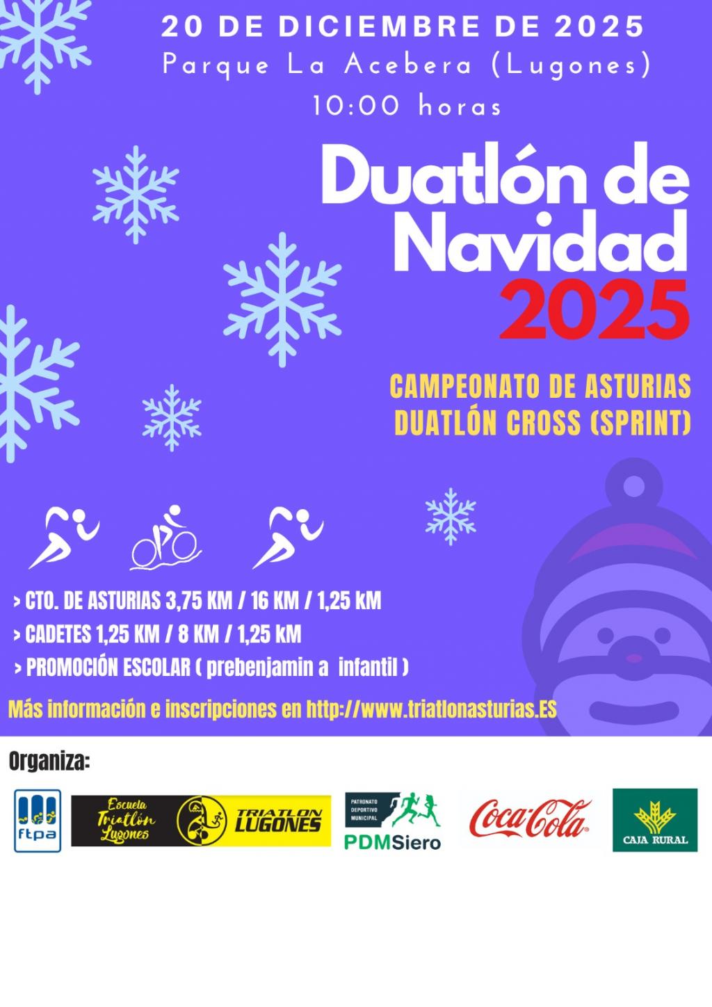 El club Triatlón Lugones organiza el 20 de diciembre en el parque de La Cebera de Lugones el Duatlón de Navidad 2025, que es campeonato de Asturias y Duatlón Cross Sprint. La prueba se iniciará a las 10 horas. Para más información y la formalización de las inscripciones tienen que realizarse a través de www.triatlonasturias.es.