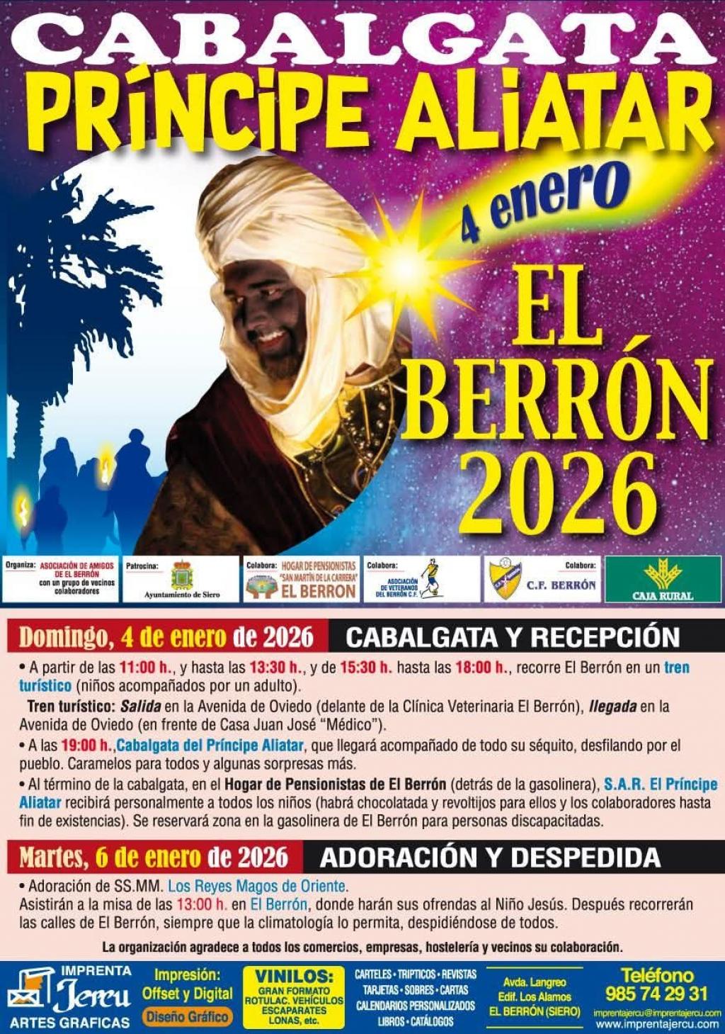 A las 19:00 h tendrá lugar la Cabalgata del Príncipe Aliatar, que llegará acompañado de su séquito y desfilará por las calles de El Berrón. Se repartirá caramelos y habrá alguna sorpresa. Al finalizar, en el Hogar de Pensionistas de El Berrón, S.A.R. el Príncipe Aliatar recibirá personalmente a los niños y niñas. Además, se ofrecerá chocolatada y revoltijos para los menores y las personas colaboradoras, hasta fin de existencias.