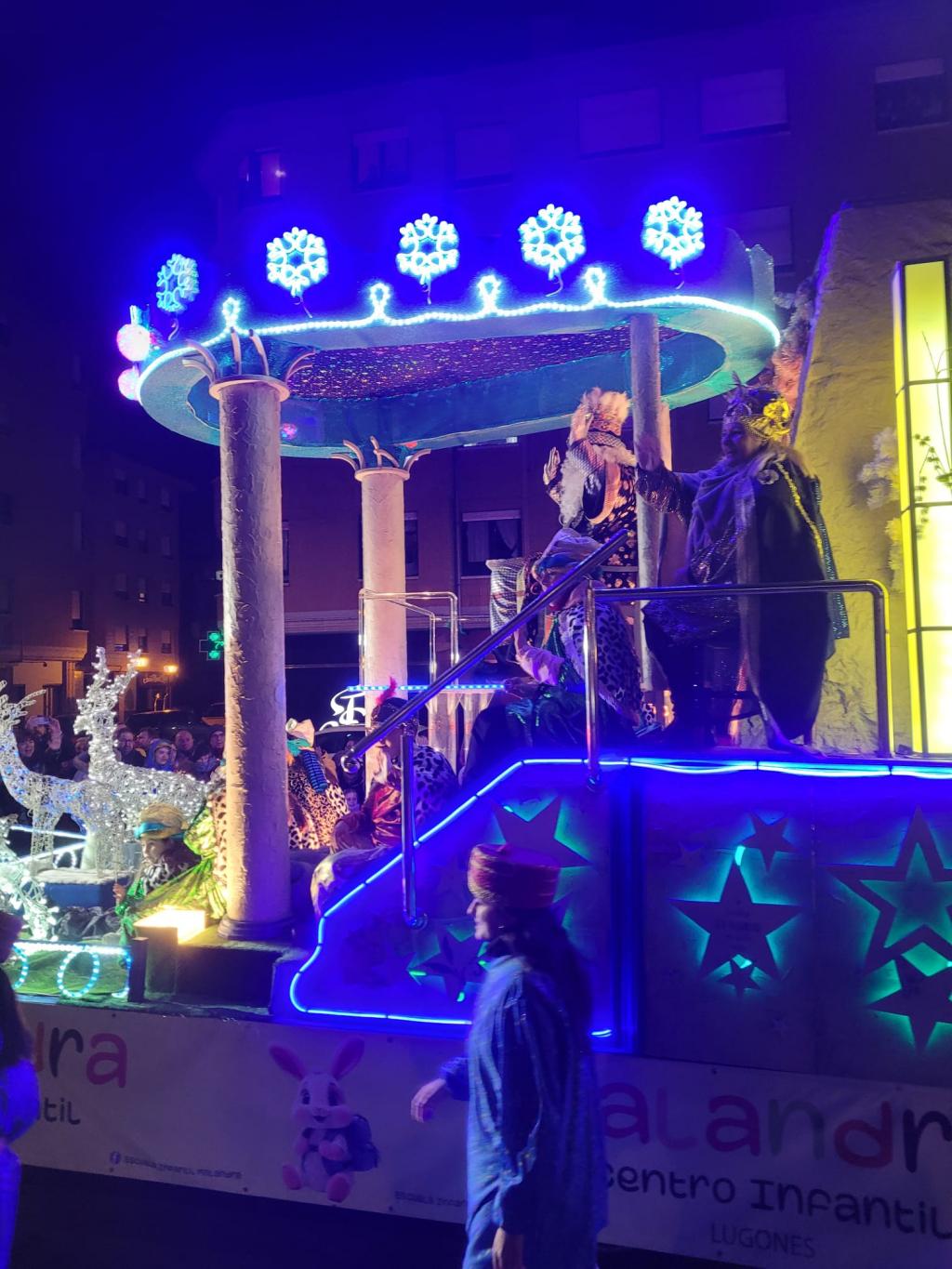 Fueron miles las personas que se acercaron a Lugones a disfrutar un año más de la Cabalgata de los Reyes Mago de Oriente. La Asociación de la Cabalgada de Lugones (Acarlug) fue la encargada de organiza este gran evento, que contó con 500 figurantes y 13 carrozas, una más que en ediciones anteriores. La novedad este año fue que finalizó en la Avenida de Gijón, en la esquina con la calle Río Nora, y la Adoración al Niño se realizó en la iglesia San Félix, donde los Reyes fueron recibidos por el sacerdote, Joaquín Manuel Serrano.