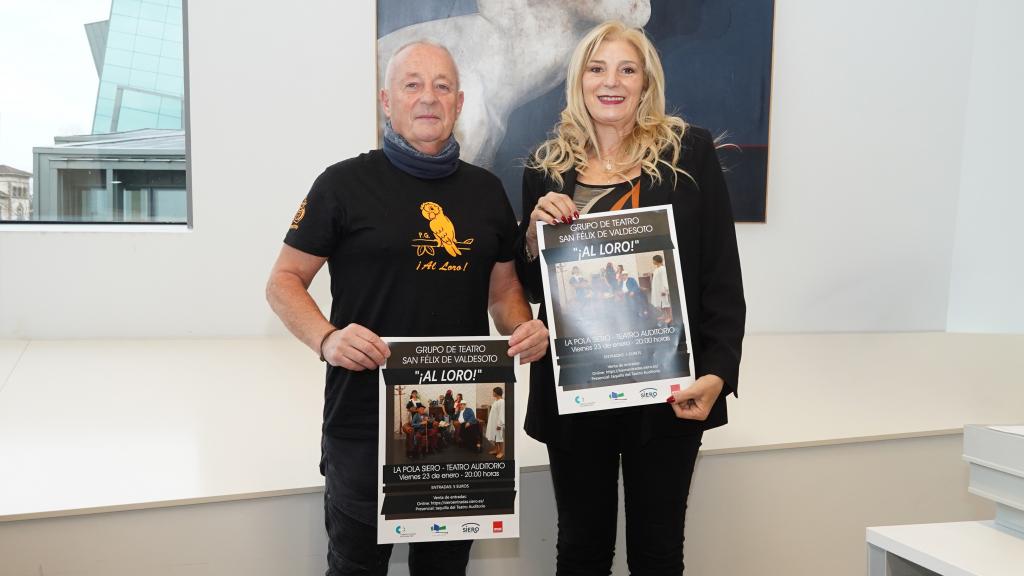 La concejala de Cultura, Recursos Humanos y Policía Local, Aurora Cienfuegos, junto a Pepín García, del Grupo de Teatro San Félix de Valdesoto, presentó la obra "¡Al loro!", que se representará el día 23 de enero, a las 20 horas, en el Teatro Auditorio de Pola de Siero.