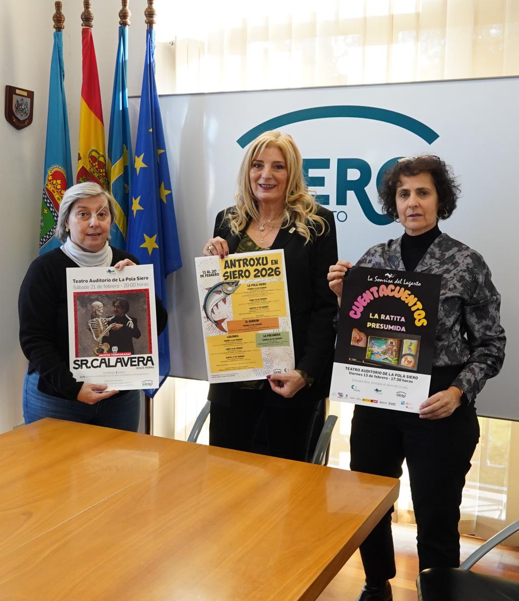 La concejala de Cultura, Recursos Humanos y Policía Local, Aurora Cienfuegos, junto a Isabel González, directora de la Fundación Municipal de Cultura de Siero y Mercedes Rodríguez, técnico municipal, presentó la programación del Antroxu de Siero 2026, así como las bases de los concursos de disfraces de Pola de Siero y Lugones.
