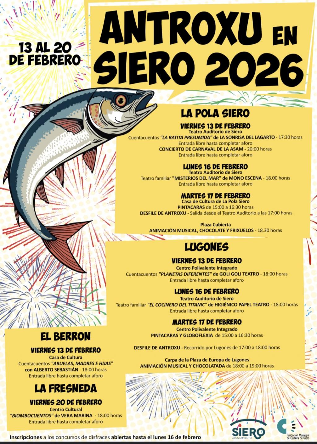Las actividades comenzarán el 13 de febrero con cuentacuentos infantiles y el Concierto de Carnaval a cargo de la Banda de Música de Siero (ASAM). A lo largo de la semana habrá teatro familiar, actividades infantiles y animación en ambas localidades.