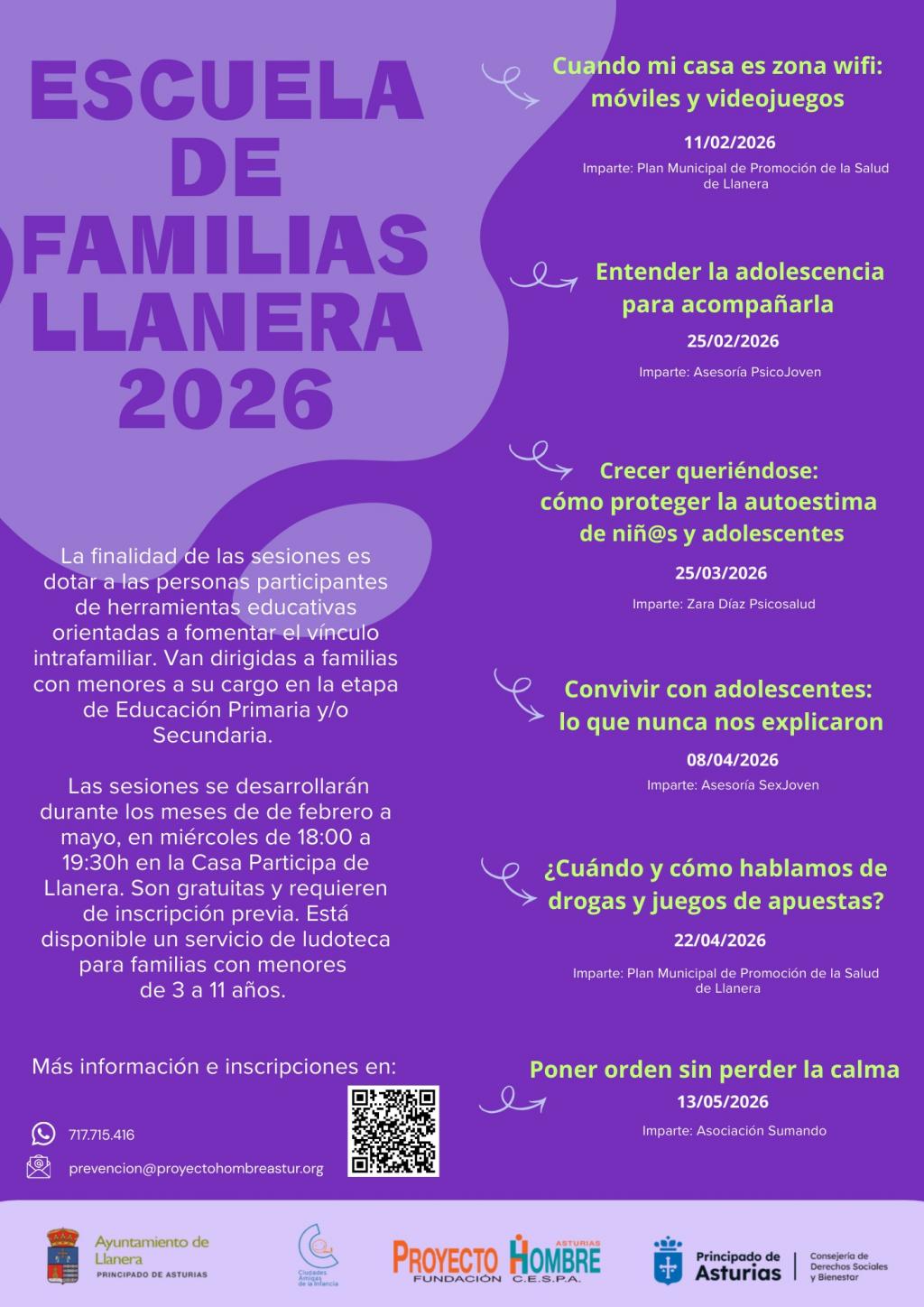 Para participar en alguna de las actividades será imprescindible la inscripción previa en: https://www.proyectohombreastur.org/escuela-familias-llanera-2026/. Más información en el teléfono 717715416 y en el email: prevencion@proyectohombreastur.org