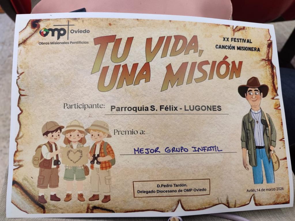 El grupo de segundo curso de catequesis de la parroquia de San Félix de Lugones ha sido galardonado con el premio al mejor grupo infantil en la vigésima edición del Festival de la Canción Misionera, celebrado el pasado sábado en el colegio Salesianos de Avilés bajo el lema “Tu vida, una misión”.